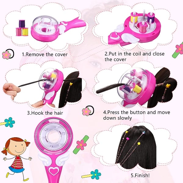 - Iepakojumā ir: Komplektā: 1x matu pīšanas mašīna, 12x matu saspraudes, 3x diegi (dzeltens, rozā un violets diegi), 2x piederumi ērtākai lietošanai.